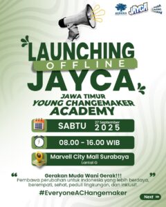 SURABAYA – Bayangin, mall yang biasanya dipenuhi diskon sepatu dan promo cuci gudang mendadak berubah jadi panggung anak muda Jawa Timur yang teriak bareng: “Muda Wani Gerak!”. Bukan sekadar jargon ala seminar motivasi, tapi deklarasi serius dari 200 orang muda di launching Jatim Young Changemaker Academy (JAYCA) di Marvel City Mall Surabaya, Sabtu (27/9/2025).