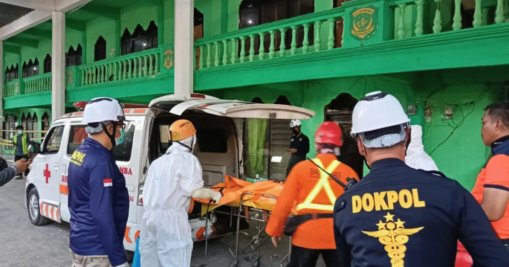 Senin petang, tim SAR gabungan masih berjibaku di sektor A1 dan A2 — titik di mana tumpukan beton berat menimpa bangunan lama.