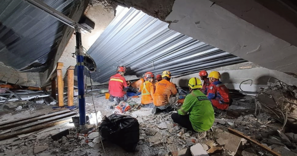 Reruntuhan masih harus dibersihkan satu per satu. Bau semen dan debu bercampur dengan isak keluarga yang masih menunggu kepastian.