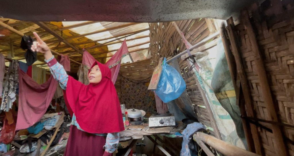 “Kalau hujan deras, saya sama anak cuma bisa pindah-pindah tempat biar gak kehujanan,” katanya lirih.